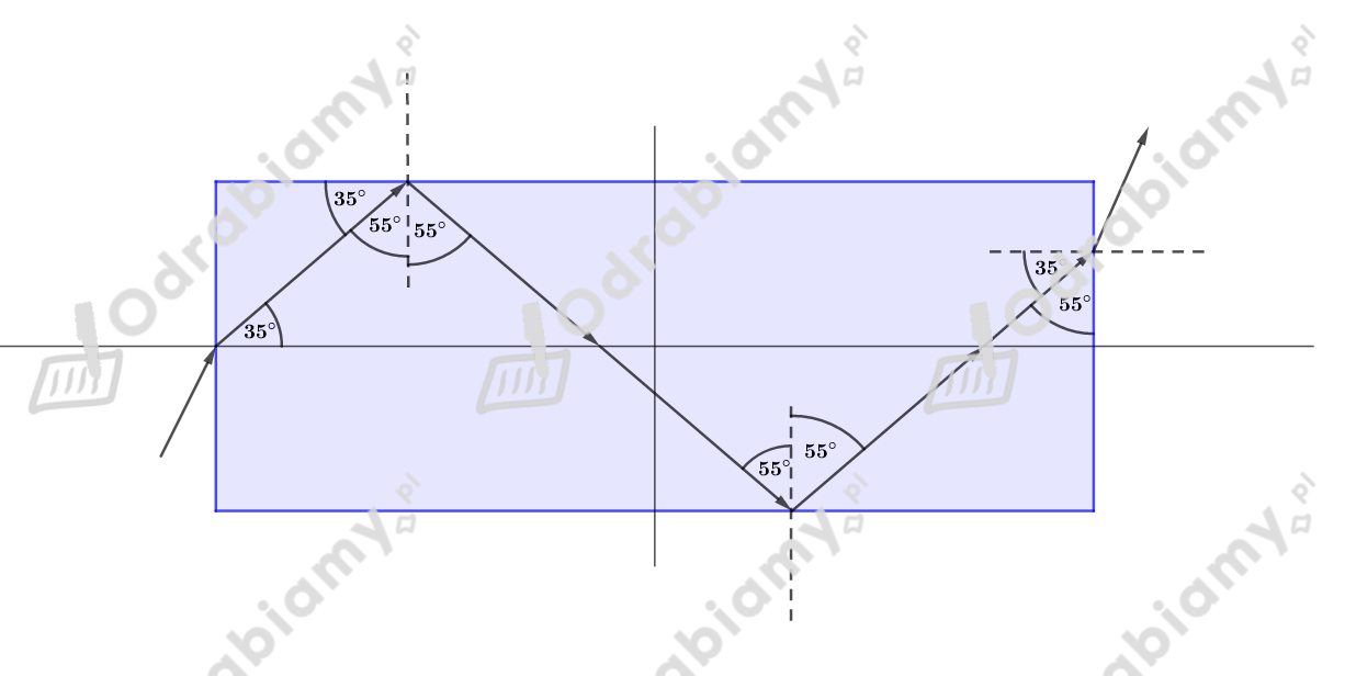 W pozostałych przypadkach (oprócz E) promienie częściowo załamią się na granicy ośrodków, a częściowo odbiją. Promień E przechodzi przez granicę ośrodków bez załamania.