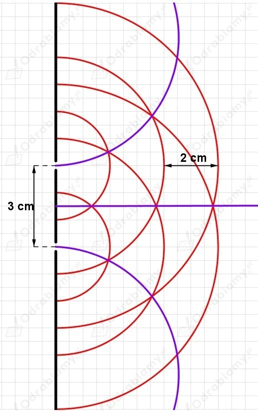 Wykonajmy rysunek na kartce w kratkę, gdzie odległość między szczelinami (ich środkami) wynosi 3 cm, a długość fali 2 cm. Zatem:
