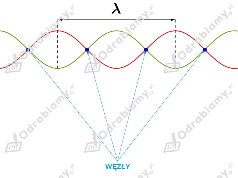 Obie fale maja długość oraz poruszają się naprzeciw siebie. Oznacza to, że węzły tych fal będą dokładnie w połowie odległości pomiędzy ich grzbietami: